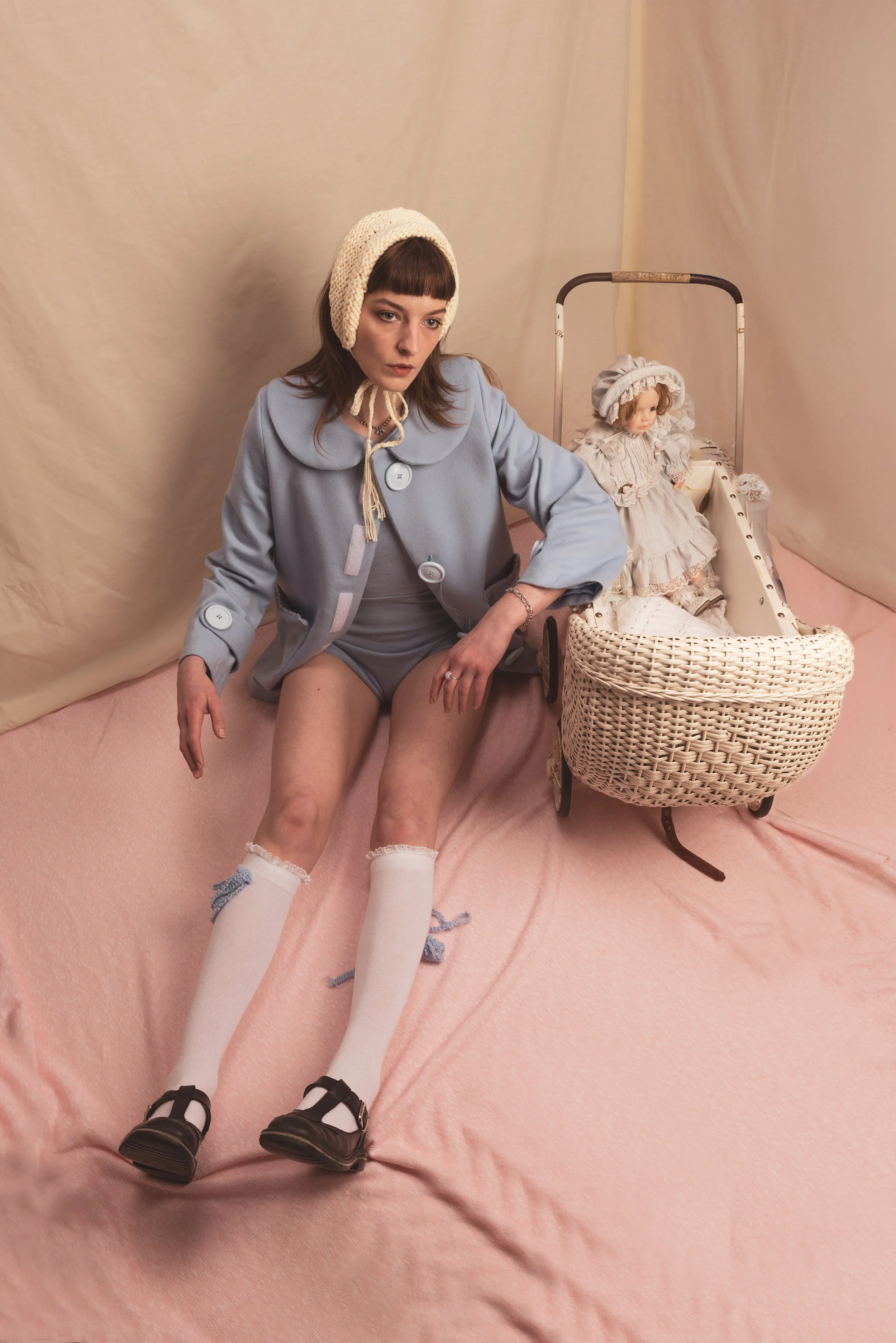 Valley of the Dolls, explores the complex relationship between dress-up dolls and young girls, focusing on how dolls can shape perceptions of beauty and self-worth, with unrealistic ideals often echoed and amplified by the beauty industry. By examining the evolution of beauty standards through a feminist lens, this collection delves into the emotional impact this has on a young girl's psyche. Exploring themes of emotional turmoil, self-perception, and nostalgia versus actual reality. Using classic silhouettes, oversized doll-like closures, and distressing techniques, the collection showcases historical research with contemporary materials and techniques. It serves as a wearable expression of turmoil and depth, offering a modern interpretation of dolls that have been worn out and played with.